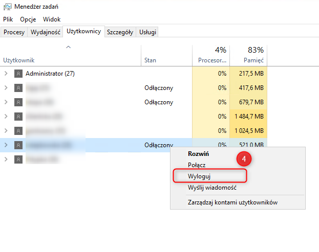 - Znajdź na liście konkretnego użytkownika (punkt 4), kliknij na niego prawym przyciskiem myszy i wybierz opcję Wyloguj (lub użyj przycisku "Wyloguj/Rozłącz" w prawym dolnym rogu okna), aby definitywnie zamknąć jego sesję i zwolnić zasoby.